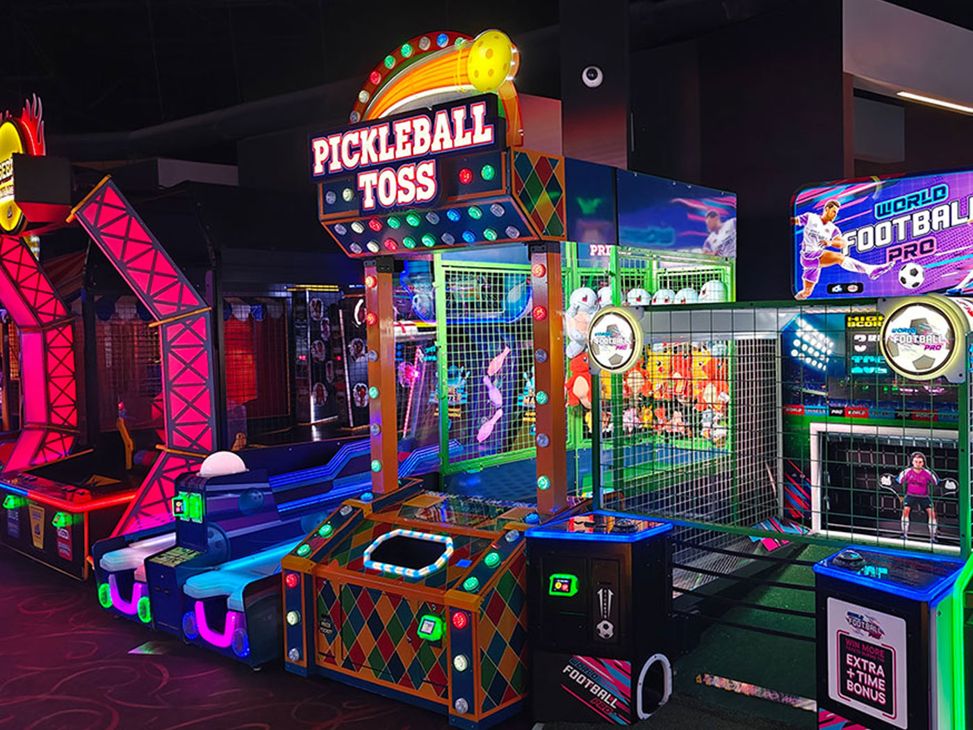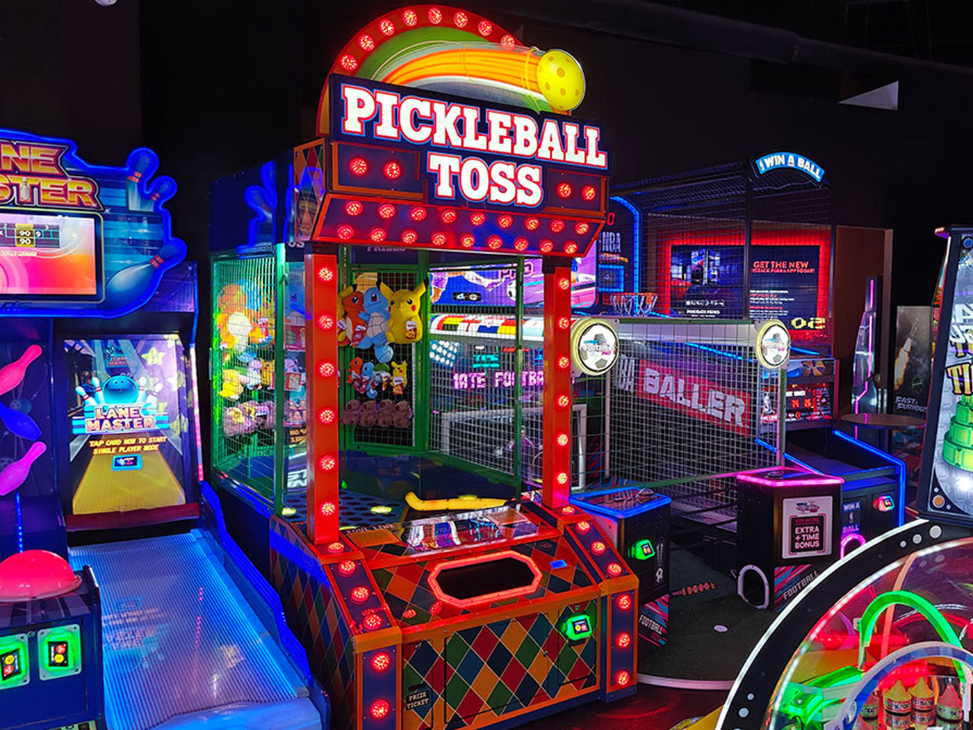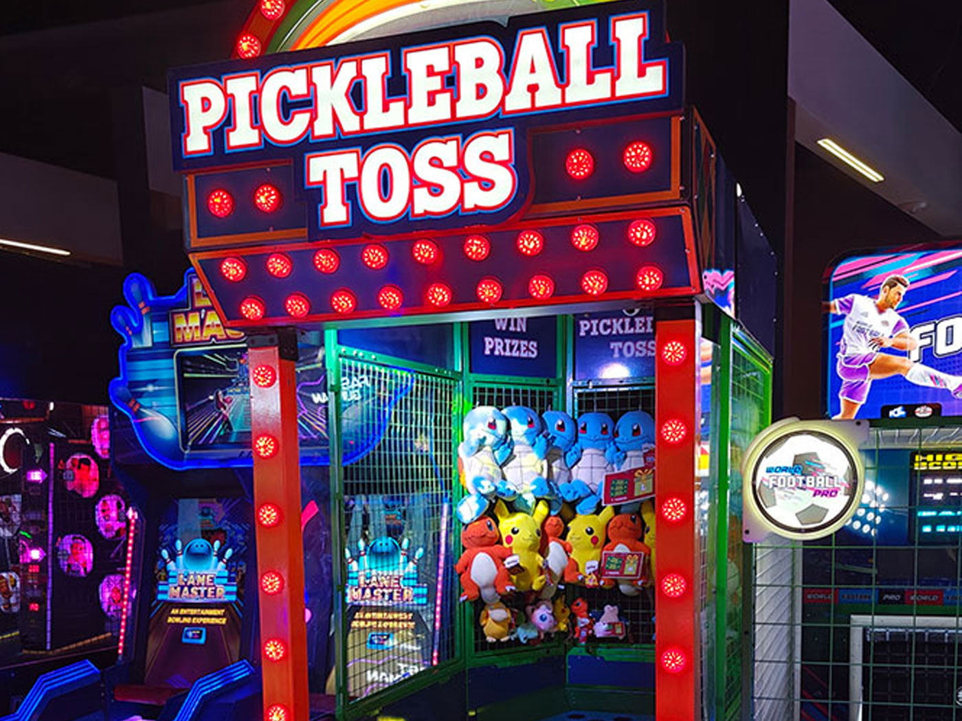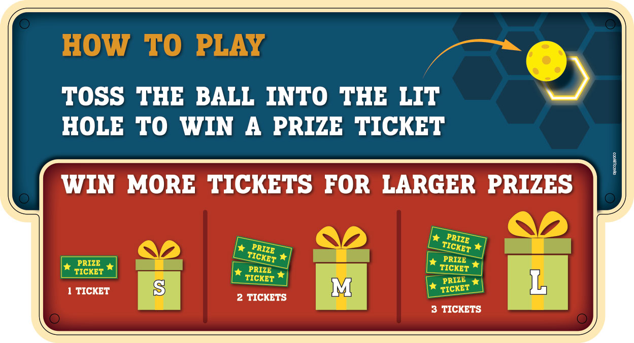 Toss the pickleballs into any one lit hole to win a prize ticket.